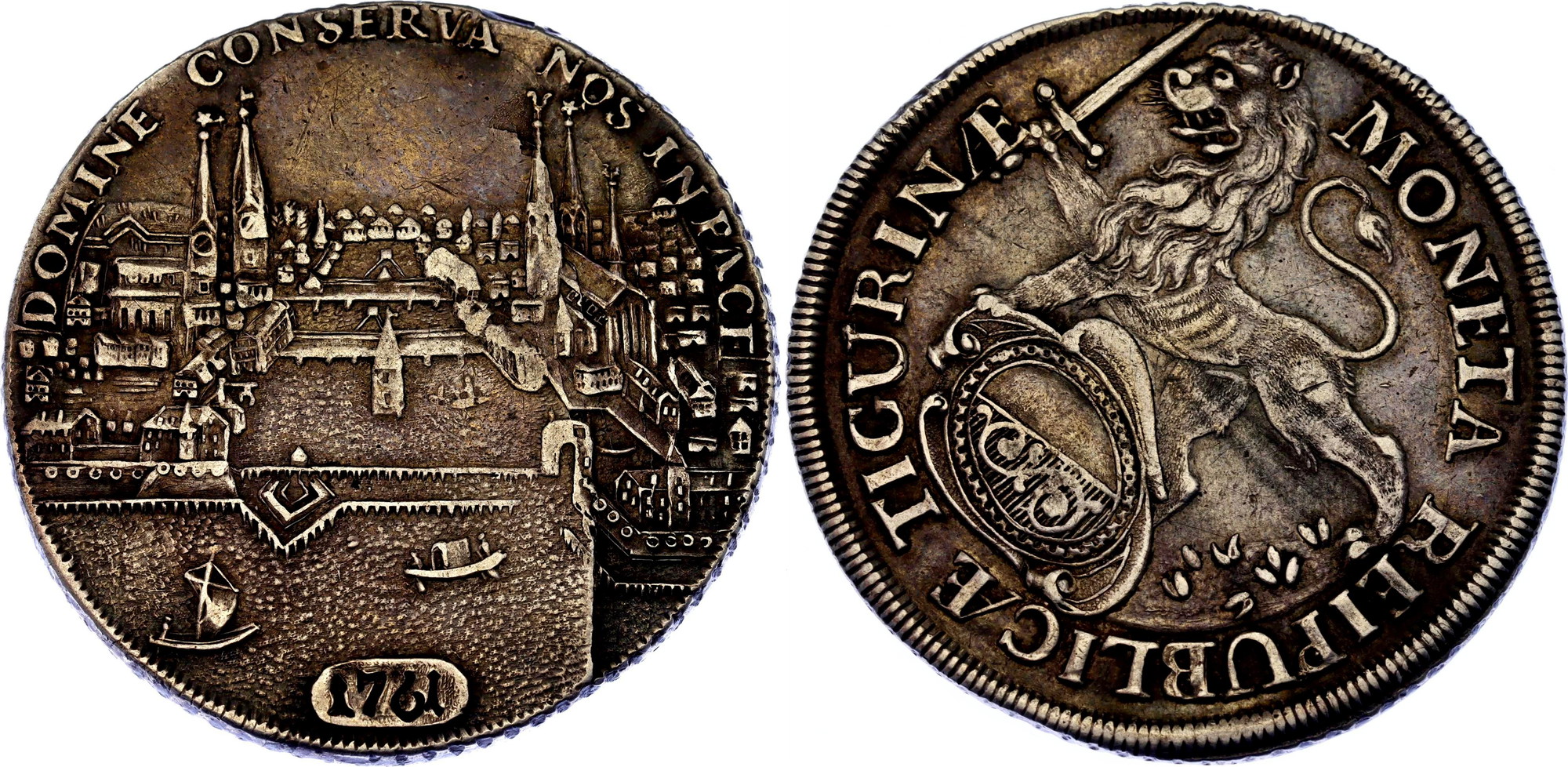 KM# 143.4; N# 24061; Silver; KM# 143.4, HMZ 2# 1164, Wunderly 1# 319, Hürlimann# 583, N# 24061; Silver 27.72 g.; Adorned with elegance, the obverse of this beautiful thaler showcases an oval coat of arms of Zürich, delicately framed in baroque style. Standing proudly beside it is a rampant lion, adding regal flair to the design. The reverse side features a breathtaking city view, capturing the essence of Zürich’s charm. Above this scene is the inscription “DOMINE CONSERVA NOS INPACE”. This coin is not only rare but also boasts a nice patina that enhances its visual appeal. Its remarkable condition elevates its rarity, making it a prized addition to any collection; AUNC; UNC with a nice dark patina; Planchet flaw