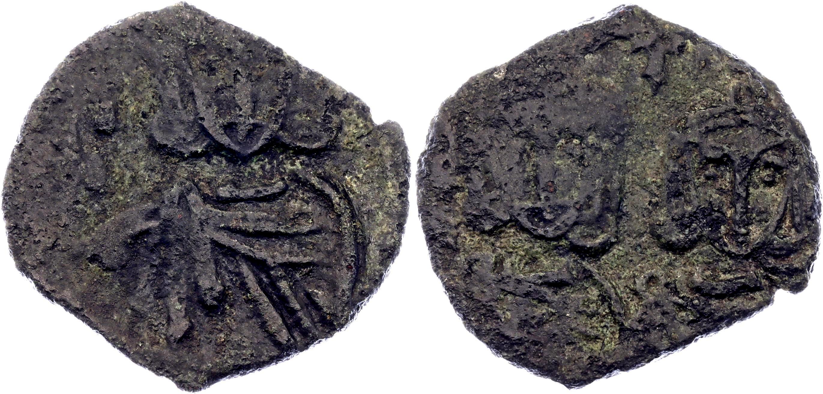 SB 1569;Copper 1.77 g.; Constantine V Copronymus, with Leo IV and Leo III; Obv: Constantine and Leo IV standing facing, each wearing crown and chlamys, ; VF