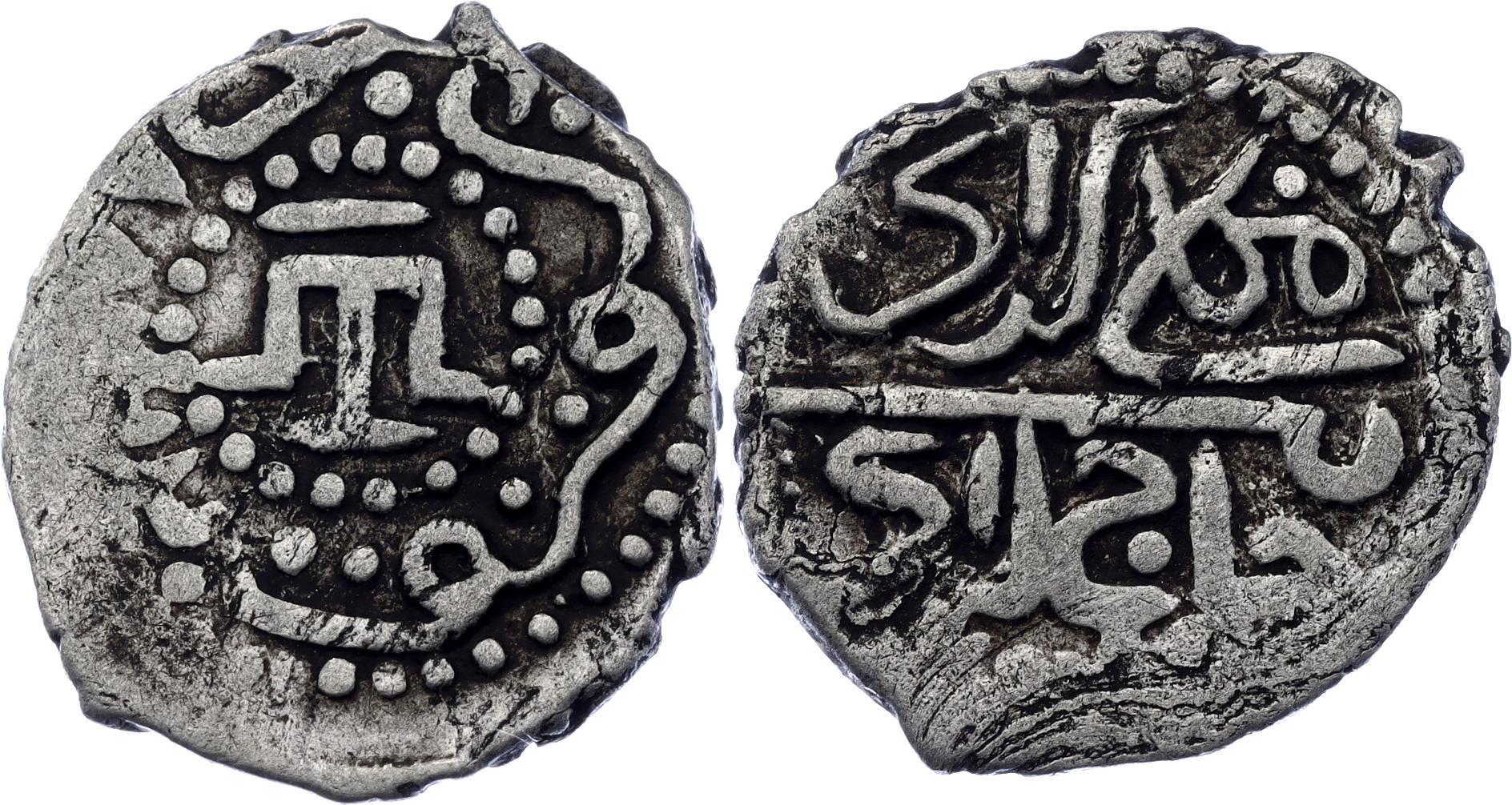Ret.# 23; N# 125357; Silver 0.67 g.; Obv: Mengli Khan / bin Hajji Giray/ Khan. Rev: Mint / Qirq Yer . 885. Tamgha in center; XF