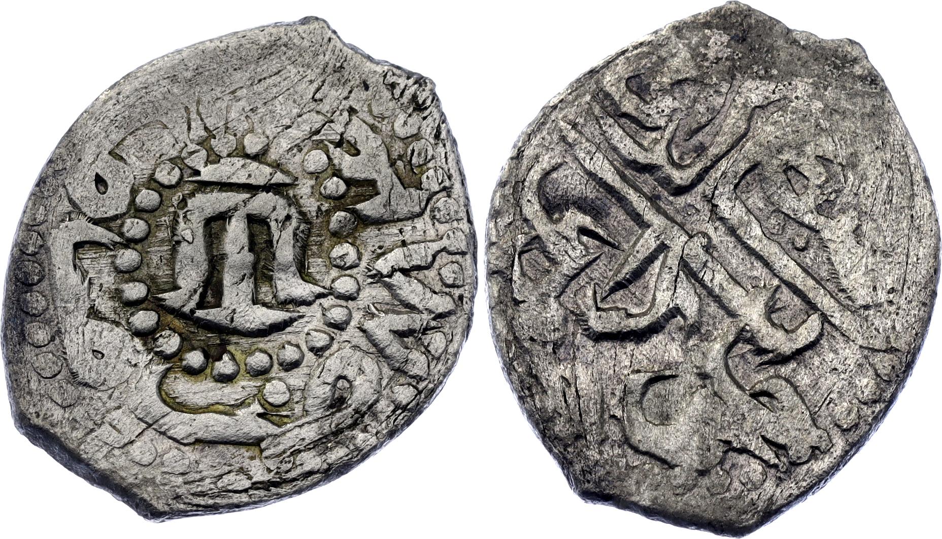 Ret.# 27; N# 125357; Silver 0.67 g.; Obv: Mengli Khan / bin Hajji Giray/ Khan. Rev: Mint / Qirq Yer . 884. Tamgha in center; XF