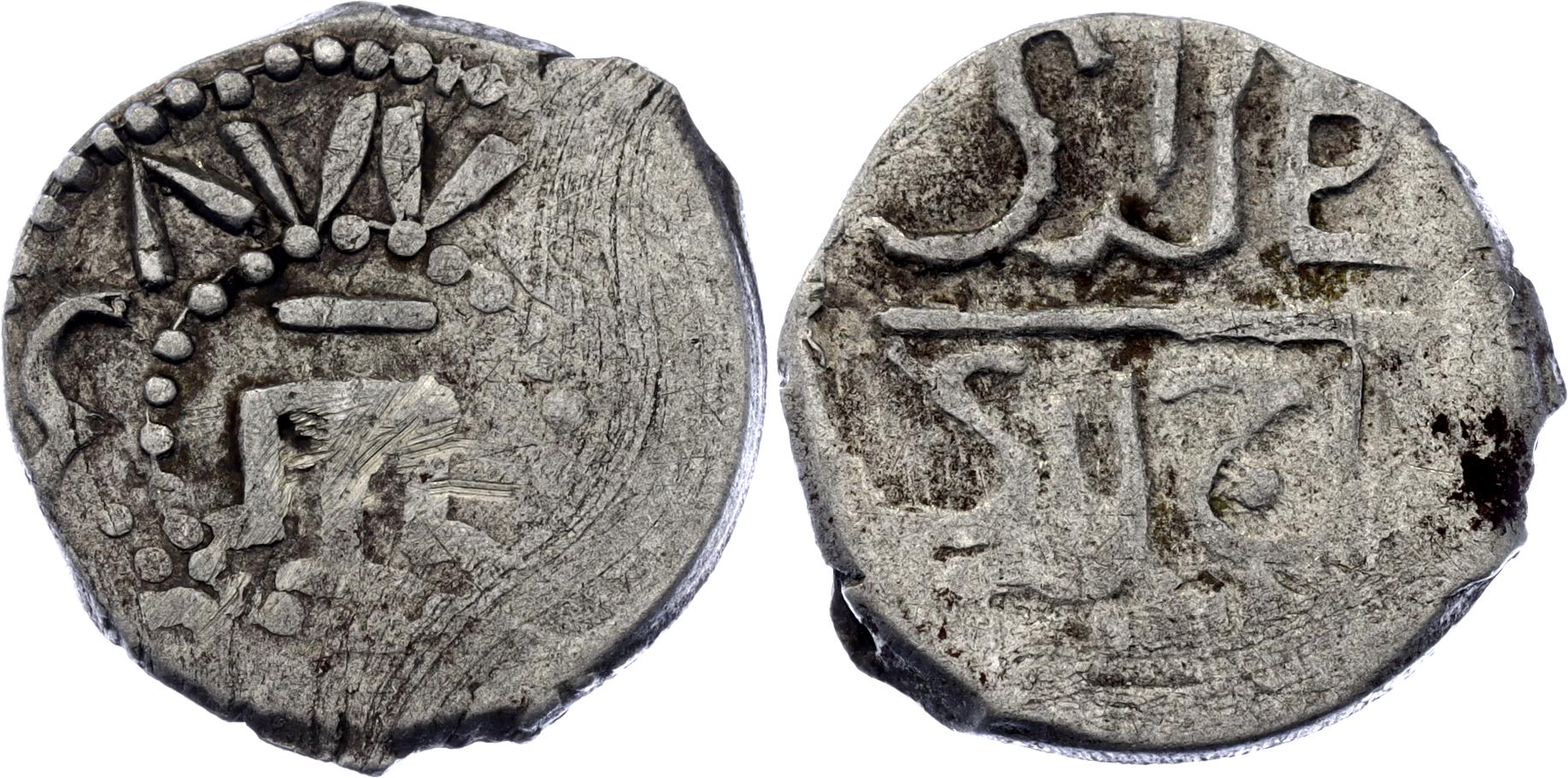 Ret.# 35-51; N# 125357; Silver 0.67 g.; Obv: Mengli Khan / bin Hajji Giray/ Khan. Rev: Mint / Qirq Yer . 887. Tamgha in center; XF