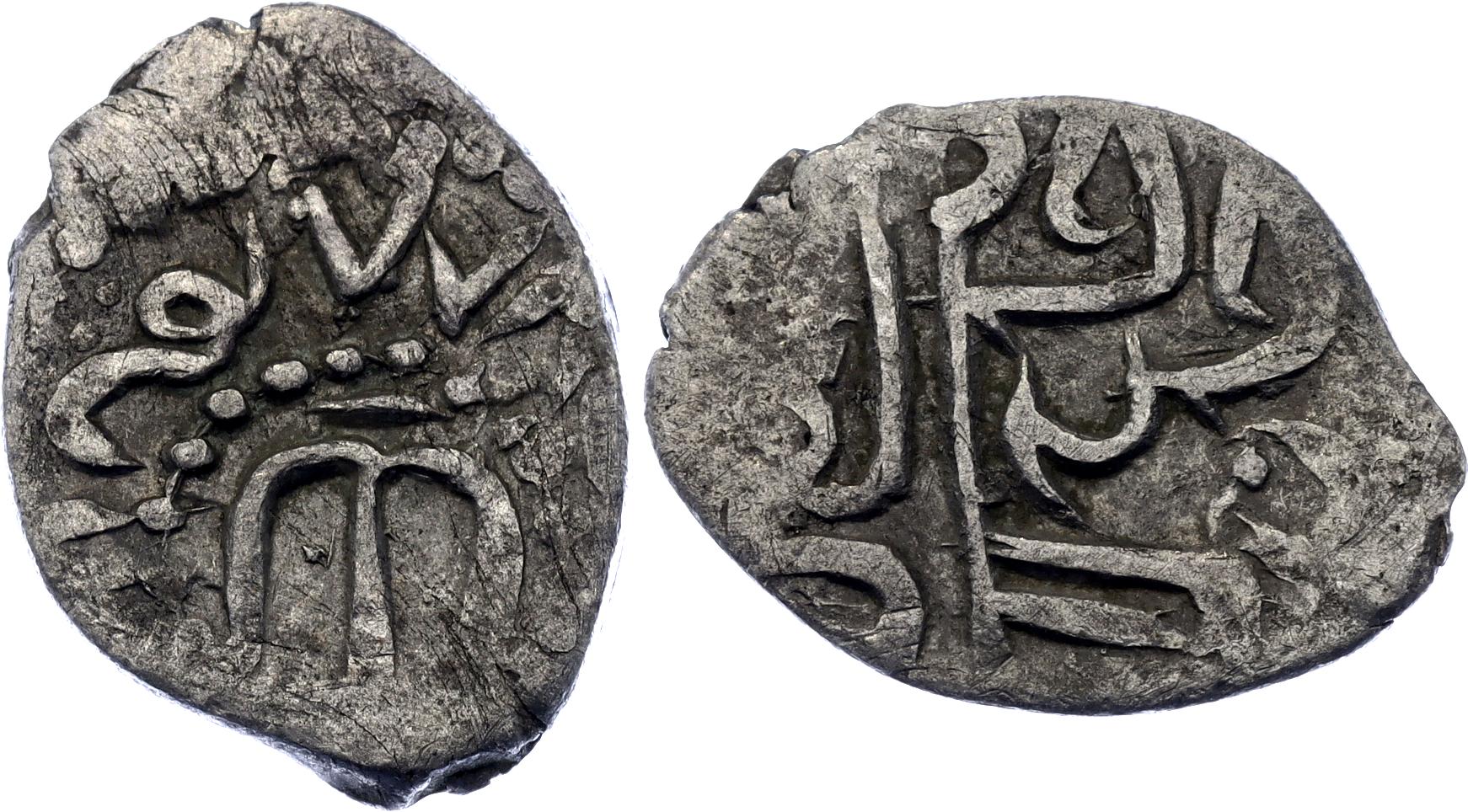 Not in Ret., Zeno#; N# 132603; Silver 0.67 g.; Obv: Mengli Khan / bin Hajji Giray/ Khan. Rev: Mint / Qrim. 887. Tamgha in center;