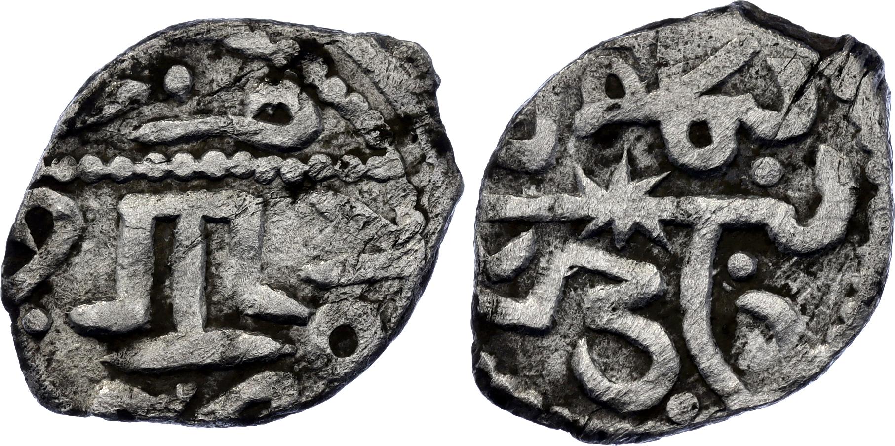 Ret.# 155 – 157; N# 80828; Silver 0.67 g.; Obv: Mengli Khan / bin Hajji Giray/ Khan. Rev: Mint / Caffa . 904 Tamgha in center;