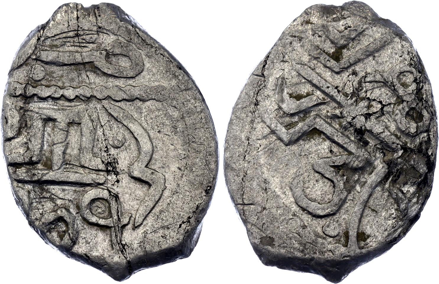 Ret.# 165 – 166; N# 80828; Silver 0.67 g.; Obv: Mengli Khan / bin Hajji Giray/ Khan. Rev: Mint / Caffa . 909 Tamgha in center;