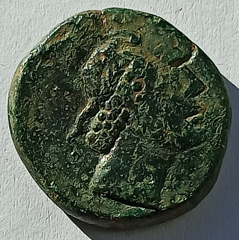 Anokhin# 1128Vladlen Opanasovych Anokhin; 2011. Античные монеты Северного Причерноморья = Antique coins of the Northern Black Sea coastal region. Stilos, Kyiv, Ukraine., SNG BM Black Sea# 955-956, MacDonald# 218, SNG Stancomb# 611, Anokhin Bosporos# 250, HGC 7# 121; N# 477689; Bronze 8.13 g.; Obv: Laureate head of Apollo right. Rev: Pegasos grazing to left. ΠANTIKA / ΠAITΩN; VF