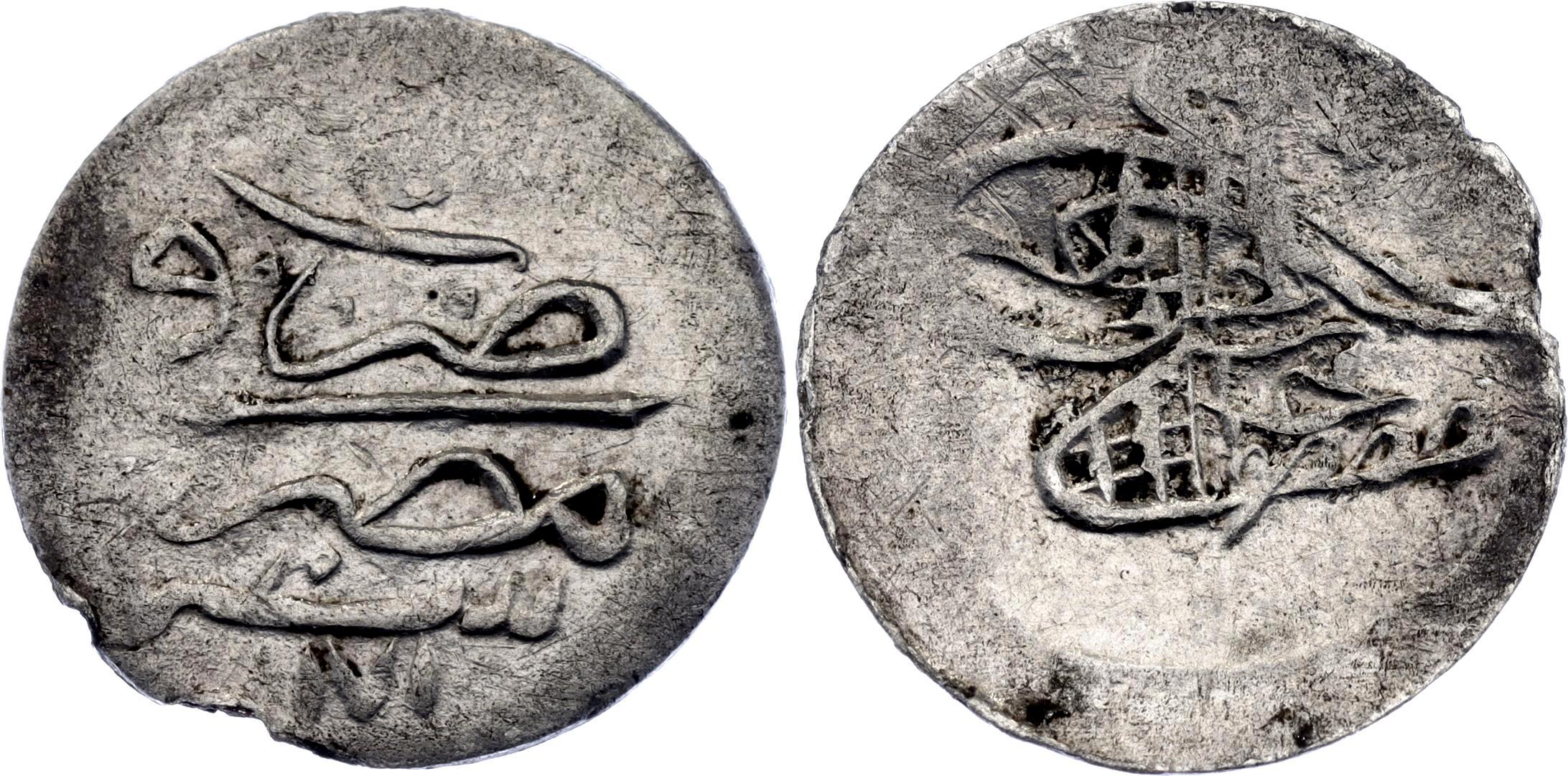 KM# 101; N# 90712; Silver 0.46 g.; Obv: Tughra of Mustafa III. Rev: Struck in Egypt. Year 1171; VF