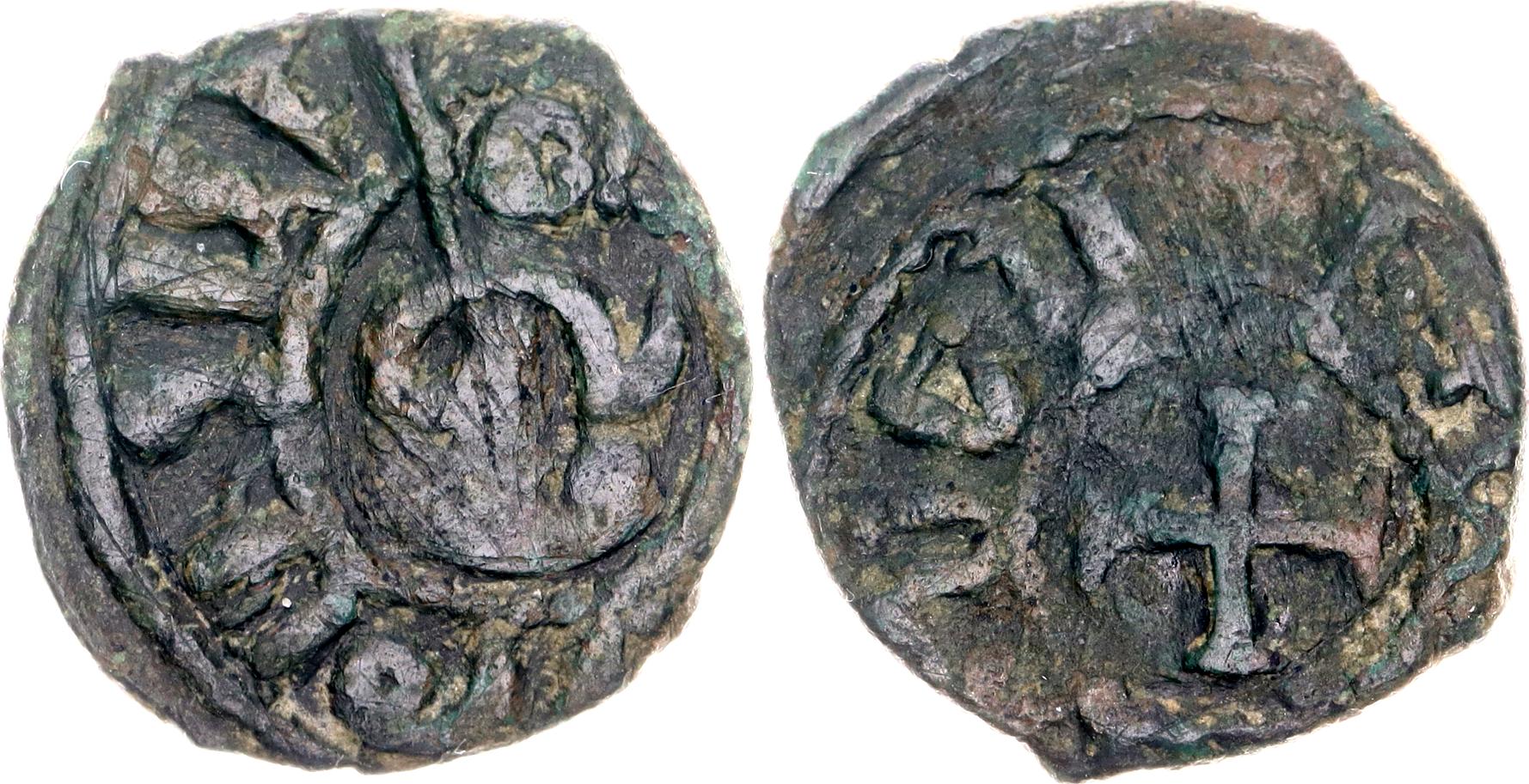 Ner# 400;Copper 2.63 g; Obv: Hetoum seated facing with legs crossed, holding cruciform sceptre and orb. Rev: Cross pattée; F; F+