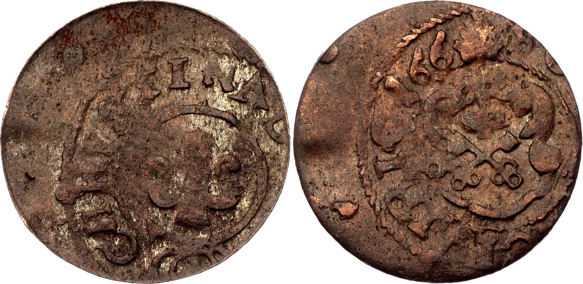 KM# 21; N# 41643; Copper; Suceava counterfeit; Date read as 166(0); The exact lettering of the surrounding legend may vary. In 1662, under the reign of Eustratie Dabija (1661-1665), the Suceava mint was re-opened in Moldavia (modern-day Romania). With the help of mintmaster Tito Livio Burattini, the mint struck many counterfeits of Livonian solidus pieces. Some say these counterfeits were used as a way to ruin the Livonian economy; others say they were struck to help Moldavia get out of its financial crisis. Either way, these counterfeits were continually produced even after Eustratie Dabija’s death, spanning over the reigns of George Ducas (1665-1666), Iliaş Alexandru (1666-1668), and the second reign of George Ducas (1668-1672) as well. These coins differ from the original pieces in a few ways: they appear much more coppery (either made of copper or very low-quality billon, depending on the source), they typically (but not always) have fictitious dates, and they are often much cruder than the originals. Even so, these forgeries are still very collectable, and are usually worth more than the real pieces.; XF