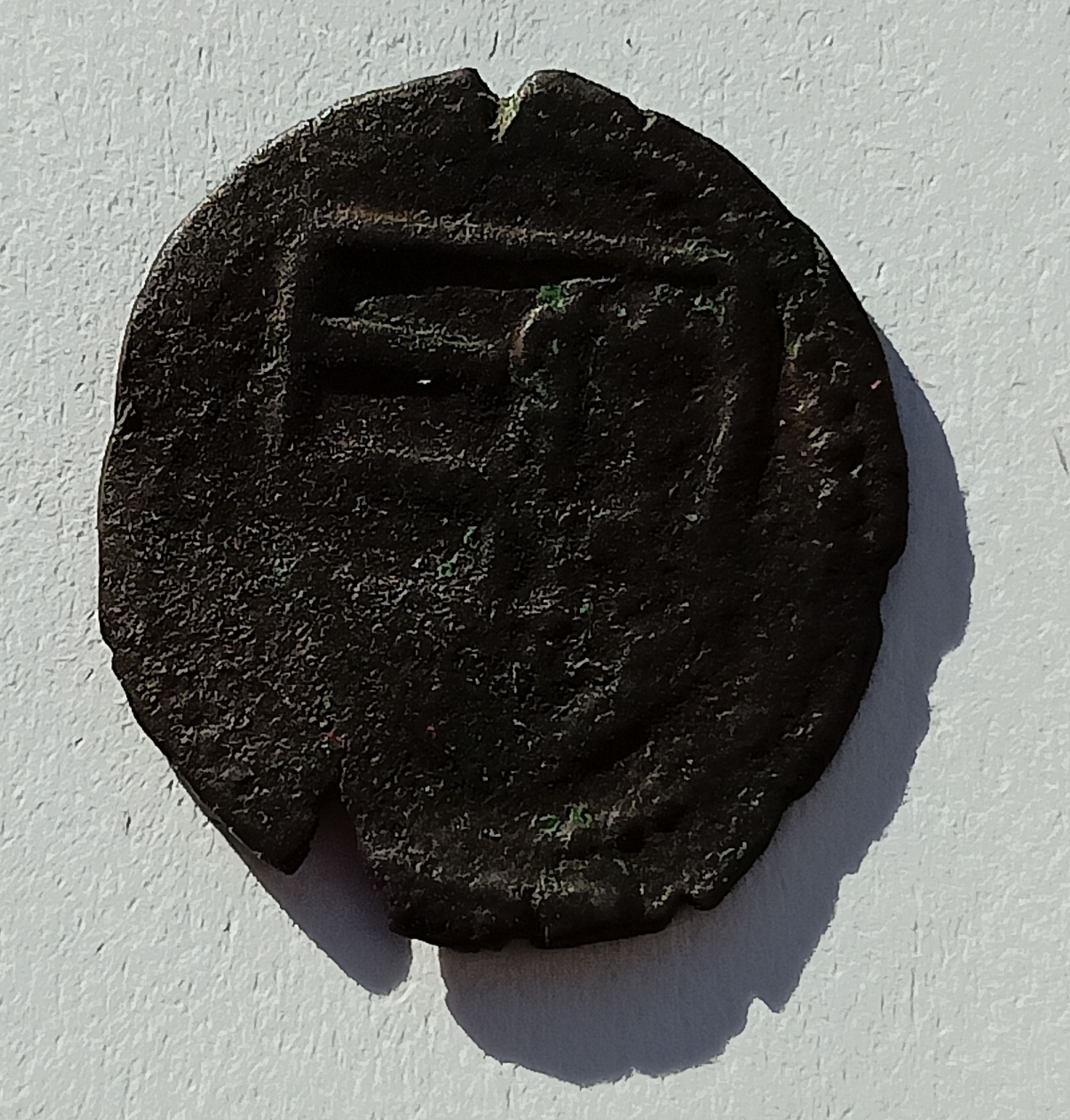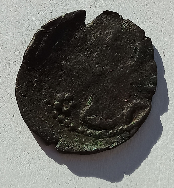 ;Copper 0.77 g.; Obv: Auroch head, star between horns, at right rosette, at left crescent. Rev: Diivided shield; VG
