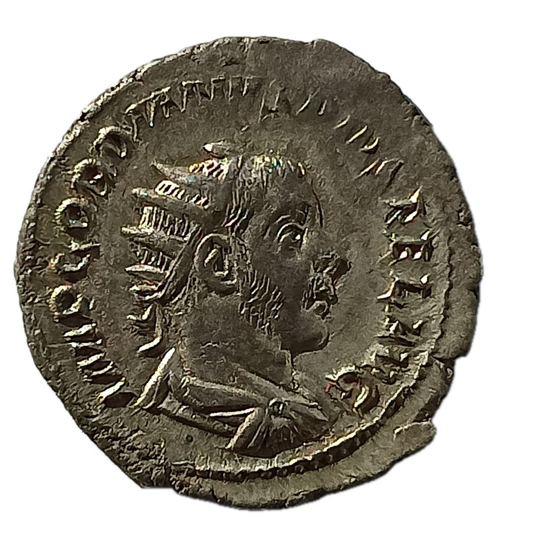 RIC IV.3# 140; N# 280870; Silver 4.23 g.; Obv: IMP GORDIANVS PIVS FEL AVG, Bust of Gordian III, radiate, draped, cuirassed facing right; Rev: FELICIT TEMP, Felicitas, draped, standing left, holding long caduceus in right hand and cornucopiae; Rome Mint; VF